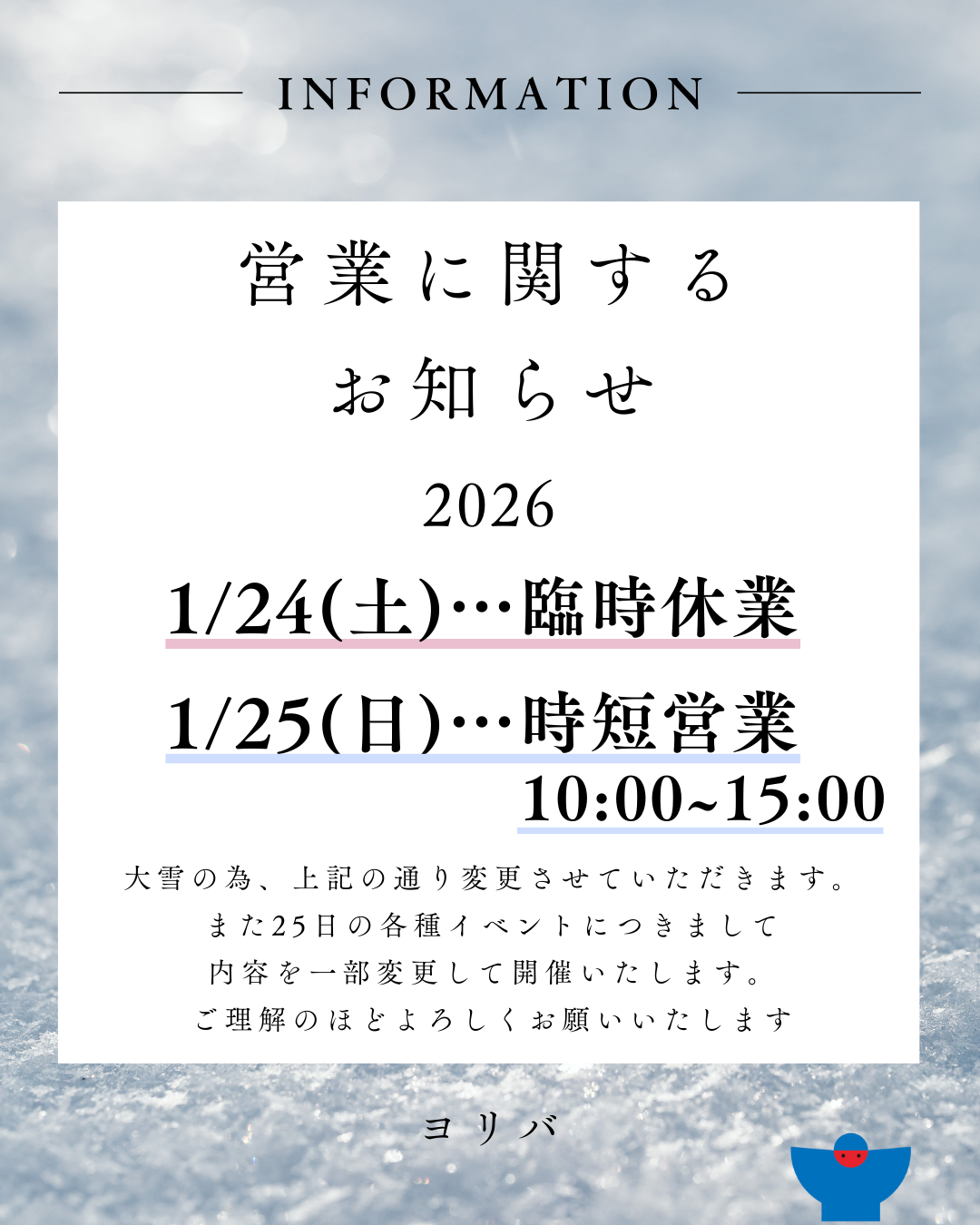 1月24日は大雪の為臨時休業。